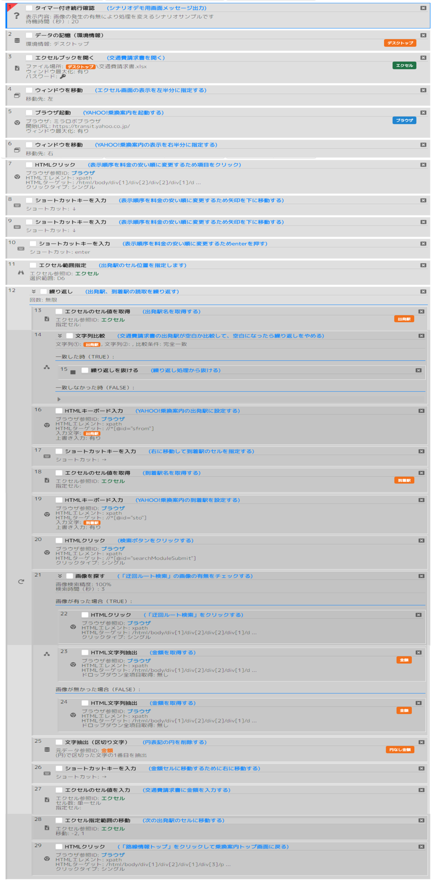 エクセルの出発駅、到着駅を読み取り、料金を検索して、料金を記入する以下の処理を繰り返す