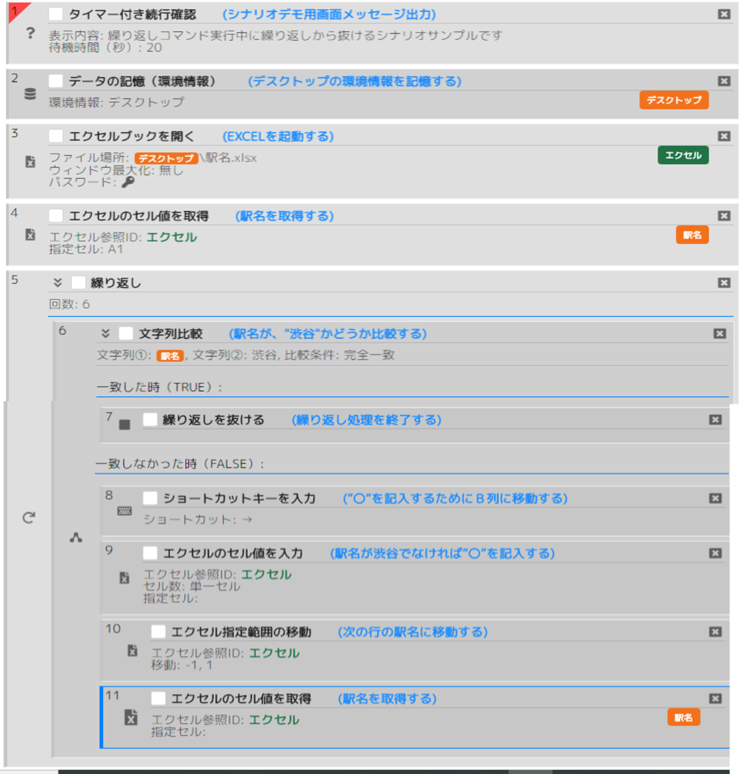 ExcelのA列の駅名を6行順番に読み、”渋谷”でなければB列に”〇”を記入して、”渋谷”であれば処理を終了する