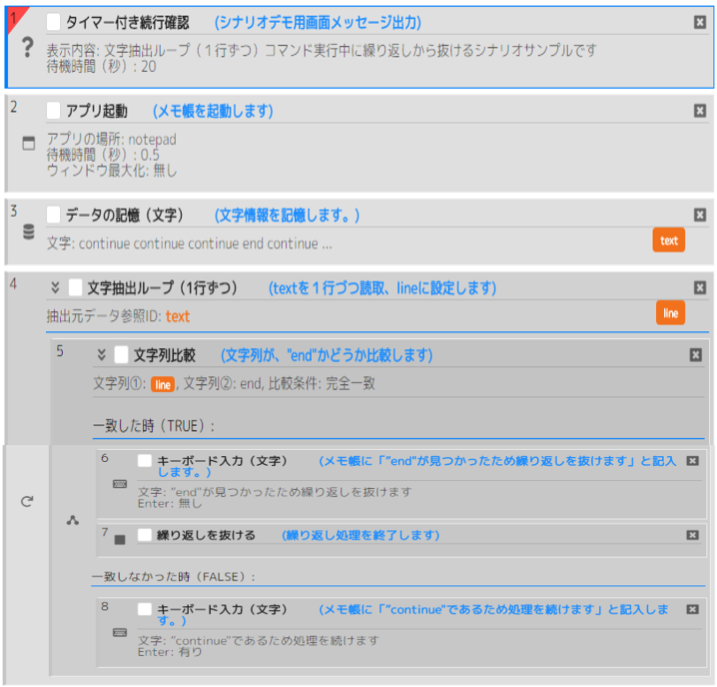 一致したとき、メモ帳に「”end"が見つかったため繰り返しを抜けます」と記入します。
