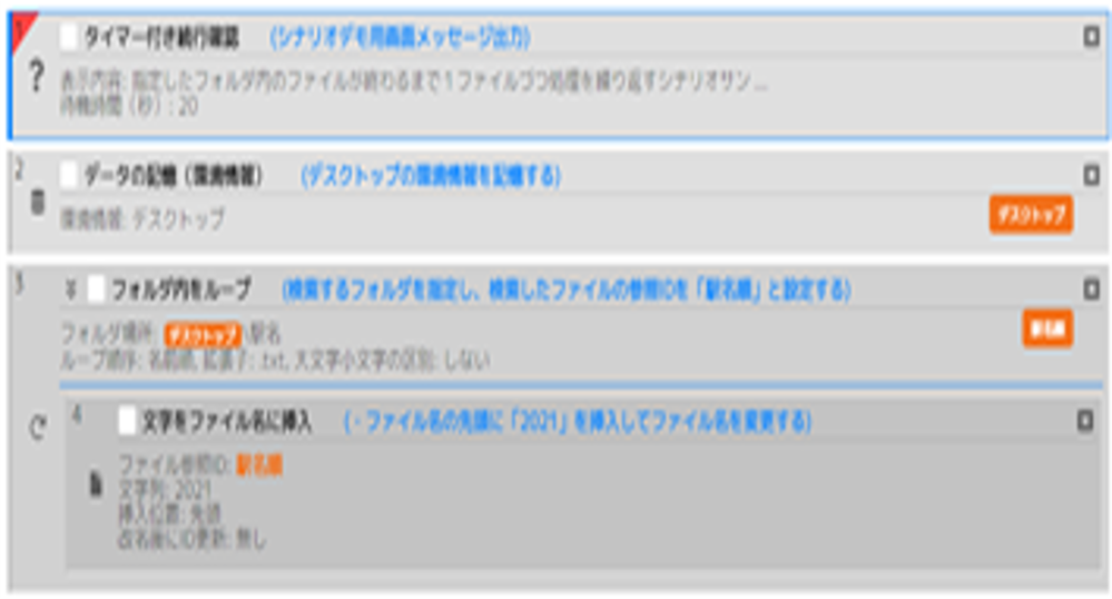 フォルダ内の .txtファイルを順番に取得して、ファイル名の先頭に日付を付けるシナリオ。