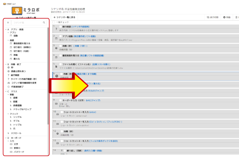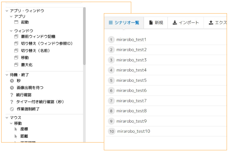 ミラロボにやってほしいキーボードやマウスの「動作」を一覧から順番に選ぶだけです。できるだけ難しい設定をしなくてもいいように、シンプル設計でありながらも、任せる範囲は無限大です。